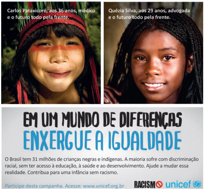 A) sugerir a arrecadação de fundos para o sustento de povos originários no país. B) sensibilizar a sociedade sobre os benefícios decorrentes do combate ao racismo. C) indicar a importância da orientação vocacional na educação de crianças no Brasil. D) chamar a atenção sobre a necessidade de ações voltadas para a educação infantil. E) valorizar o trabalho de agências internacionais na luta contra a discriminação racial.